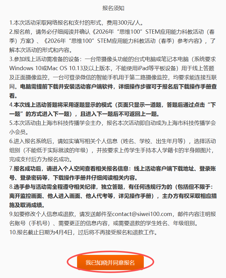 即日起,选手可登录思维100网报名参加2026年上海市“科学小公民”实践展示活动之“思维100”STEM应用能力科教活动(春季)线上活动。