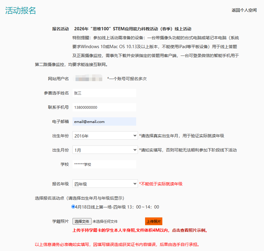 5.完善个人信息,选择参加活动的年级组别,并按要求上传选手手持本人学籍卡的半身照(如无学籍卡,可上传身份证或其他带照片的可证明本人身份的证件),可“点击查看照片示例”查看具体要求,点击“选择文件”上传符合要求的照片,完成支付后即报名成功。