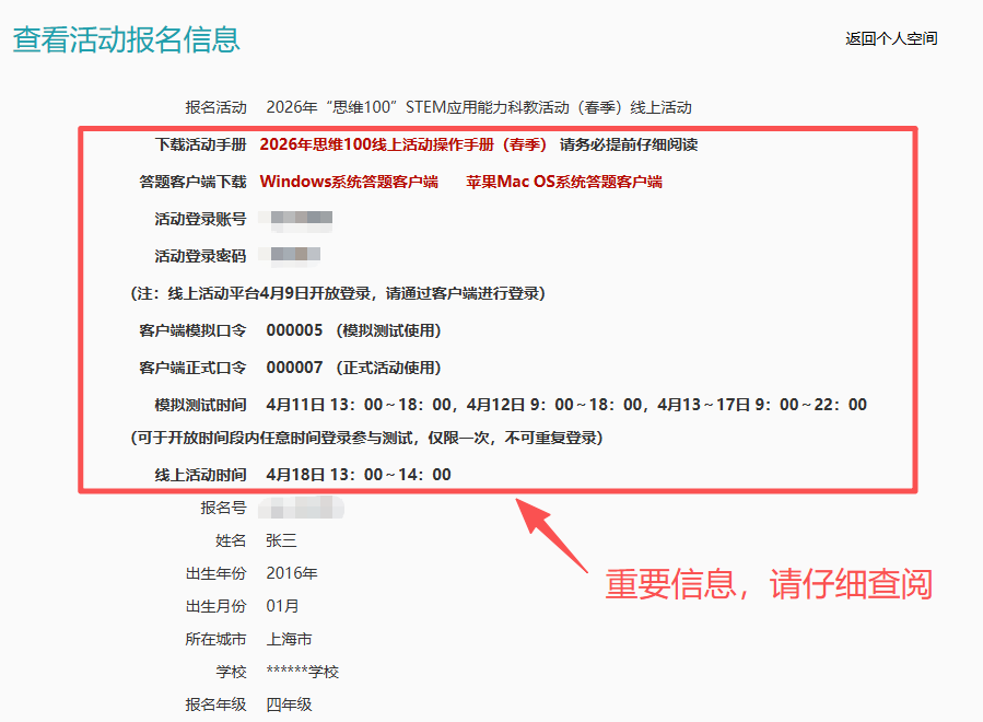6.报名成功后返回个人空间,点击“查看报名和活动信息”即可查看你的报名信息和活动详细安排(包括线上活动操作手册、客户端下载、登录账号、密码、模拟测试时间、线上活动时间等)。同时请及时下载线上活动操作手册,并仔细阅读其中内容,根据指导提前下载并安装答题客户端,熟悉线上活动操作方法。
